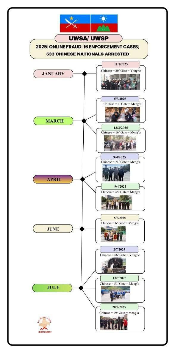 据佤邦青年之声整理的数据显示,2025年,佤邦联合军控制区共向中国方面移交了16批网络诈骗等涉案人员,包括533名中国公民及近9万名无合法证件的中国公民。